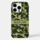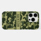 Customize this multi-hued green camouflage iPhone 16 pro case with your name in a trendy modern CAP font in dark green on light green. It's masculine and perfect for your favorite military, hunting, country or outdoorsman!