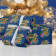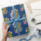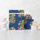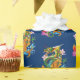 A green Chinese dragon with an orange koi fish with lotus flowers and cherry blossoms against a backdrop of dark blue.