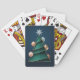 This card deck features a modern green Christmas tree illustration on a navy blue background. The tree is constructed from geometric green triangles with gold metallic outlines, creating an angular design. At the top of the tree sits a silver star topper. The tree is decorated with five spherical ornaments in metallic copper, champagne gold and light gray colors. The playing card dimensions are 2.5" by 3.5". The cards are easy to shuffle. There are 52 playing cards and 2 Jokers.