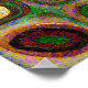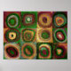 Abstract digital painting in many shades of green with yellow and maroon, circles inside squares. Made in Photoshop.