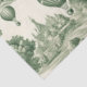 A classic Toile de Jouy pattern tissue paper in deep muted green featuring rolling countryside scenes, charming village details, and vintage hot air balloons drifting above the landscape. This elegant monochromatic design captures a timeless French aesthetic. Ideal for lovers of traditional décor, cottage style, travel-themed art, and unique vintage-inspired gifts.