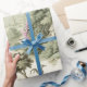 A classic Toile de Jouy pattern wrapping paper in deep muted green featuring rolling countryside scenes, charming village details, and vintage hot air balloons drifting above the landscape. This elegant monochromatic design captures a timeless French aesthetic. Ideal for lovers of traditional décor, cottage style, travel-themed art, and unique vintage-inspired gifts.