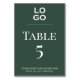 This custom corporate event or party table number card features a sample logo placed at the top which you can replace with your own custom business or company logo. The table number is printed in a large sophisticated font below the logo, followed by the company or host name printed at the bottom. The background is a pine forest green colour.