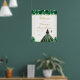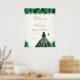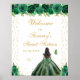 This elegant and glamourous sweet sixteen welcome sign features a beautiful princess with dark hair and dark skin in a green ball gown. The text combines handwritten script and modern sans serif fonts for a classy and sophisticated look. The floral arrangements, butterflies and gold confetti create the perfect blend of rustic and chic.