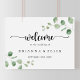 This green delight eucalyptus wedding welcome sign is perfect for a modern wedding. The design features watercolor hand-drawn elegant botanical eucalyptus branches and leaves. Make this poster your own by adding the name of the bride and groom, and the date of the wedding.