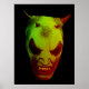 Scary green devil with lizard textured skin, horns, large teeth and fangs.