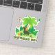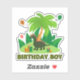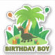 Cute green dinosaur with palms, presents, balloons and text BIRTHDAY BOY