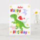 A fun 4th birthday card. This bright third birthday card features a cartoon green T-Rex dinosaur, Pterodactyl, Brontosaurus and a Triceratops, yellow stars and a colorful Happy Birthday text. A cute design for someone who will be four years old. The birthday age and the child's name on the front of the card can be changed to customize it for the special boy or girl. The message inside can also be amended to personalize it.