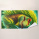 This bath towel has a green dinosaur on it.