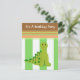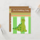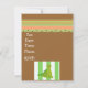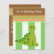 A cute dinosaur with a green body, dark green spots and a spikey tail. A background of green and white stripes behind him. A border of brown with fun stripes in greens and orange colours accent it. Customise with all of your party information as desired.