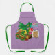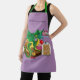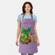 A small green dragon sits on a wooden cutting board on a kitchen counter top. Baked goods such as muffins, cookies and cupcakes are all around the green kitchen dragon in a backdrop of purple