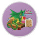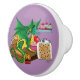 A small green dragon sits upon a wooden cutting board on a kitchen counter top. Baked goods such as cookies, muffins and cupcakes are all around the kitchen green dragon in a backdrop of purple.