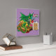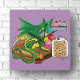 A small green dragon sits on a wooden cutting board on a kitchen counter top. Baked goods scubas cookies, muffins and cupcakes are all around the green kitchen dragon in a backdrop of purple.