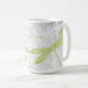 Enjoy your morning coffee with a Green Dragonfly Personalised Coffee Mug. Mug design features a colourful dragonfly, a soft white leafy vine against a light grey grunge damask background with an area to personalise with your name. Additional gift items available with this design as well as a variety of colours.