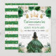 Elegant watercolor Black Haired princess in dark green salon western dress design with green and white flowers, butterflies and gold glitter confetti.