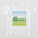 A globe in the word green forming green earth world. This design looks really effective on this Boys T-Shirt