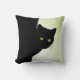 Sly black cat with emerald green eyes looks out from behind black wall into a green room.