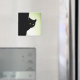Sly black cat with emerald green eyes looks out from behind black wall into a green room.