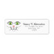 This customisable typography and script return address label design features a colourful drawing of a cute, smiling green eyed happy cat face with whiskers and a pink nose.
