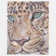 A peaceful pose of a leopard that stares dreamily into the distance. Its eyes are green instead of the usual yellowish colour. Its closed mouth is relaxed. The perfect guardian creature to feel safely protected by while sleeping. A reproduction of a coloured pencil drawing by artist Joyce Jackson.