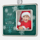The photo on this green, turquoise and white snowflake "It's the most wonderful time of the year" family Christmas photo ornament can be changed to your own family, child, or couple photo. Snowflakes and deer on a dark green background. Snowflakes and snow are white and turquoise (teal).