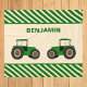 This design features two cute farm tractors with green and beige stripes border. Customise it with your name.