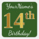 Green, Faux Gold 14th Birthday + Custom Name Square Sticker