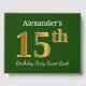 This guest book design features the ordinal number "15th" with a faux gold-like appearance. It also features a customised name, and a green coloured background. It could be used at a party for somebody celebrating their fifteenth birthday. [~Z0000056]