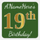 Green, Faux Gold 19th Birthday + Custom Name Square Sticker