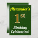 This birthday party invitation design features a message like "Alexander’s 1st Birthday Celebration!", where the name can be personalised, and where the number "1st" has a faux gold-like appearance. It also features a green coloured background. The event details on the back can be personalised. It could be used to invite people to somebody’s first birthday celebration or birthday party. [~Z0000121]