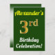 Green, Faux Gold 3rd Birthday Celebration + Name Invitation