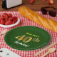 This simple, customised, birthday-themed paper plate design features a customisable message like "Name-Here’s 40th Birthday!", where the name can be changed, and with the "40th" having a faux/imitation gold-like appearance. It also features a green coloured background. Paper plates like these could perhaps be used at a party being held to celebrate somebody’s fortieth birthday. [~Z0000145]