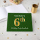 This guest book design features the ordinal number "6th" with a faux gold-like appearance. It also features a customised name, and a green coloured background. It could be used at a party for somebody celebrating their sixth birthday. [~Z0000056]