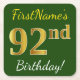Green, Faux Gold 92nd Birthday + Custom Name Square Paper Coaster
