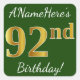 Green, Faux Gold 92nd Birthday + Custom Name Square Sticker