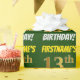 This wrapping paper design features a message like "FIRSTNAME’S 13th BIRTHDAY!", with the "13th" having a faux/imitation gold-like colour appearance, and with the name and "BIRTHDAY" in a fun, bold font. The name is customisable, and the background is coloured green. Wrapping paper like this could perhaps be used when wrapping birthday gifts being given to somebody in celebration of their thirteenth birthday. [~Z0000208]