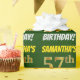 This wrapping paper design features a message like "SAMANTHA’S 57th BIRTHDAY!", with the "57th" having a faux/imitation gold-like colour appearance, and with the name and "BIRTHDAY" in a fun, bold font. The name can be customised, and the background is coloured green. Wrapping paper like this could perhaps be used when wrapping birthday gifts being given to somebody in celebration of their fifty seventh birthday. [~Z0000208]