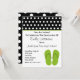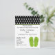 A birthday party invite featuring a black border with white polka dots at top with green trim. Illustration of a pair of green flip flops at bottom right. Personalise the black text with details of your occasion. Opposite side is black with white dots. Look for matching postage and address labels at Jill's Paperie.
