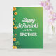 This greeting card features a green gradient background that shifts from bright lime in the upper right to deep emerald in the lower left, setting a festive St. Patrick’s Day scene 💚. Centered on the front, the main message reads “Happy St. Patrick’s Day” in flowing white lettering, with “BROTHER” placed just below in large uppercase letters for emphasis. Small, simple arrows sit near the word “DAY,” subtly pointing inward as if guiding your eyes back to the greeting. Along the left edge, a vertical border of stylized flowers and clover shapes forms a decorative garland that feels like a friendly nudge from someone who knows you well ☘️. The flowers are sunny yellow with rounded petals, and each clover-like green shape is marked with a small red dot at its center. Soft shadowing gives the border elements a slight layered look, adding depth against the smooth background. The overall layout keeps the text clear in the middle while the floral strip frames it from the side, with lime-to-emerald color fading diagonally behind everything.