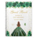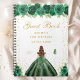 This elegant and glamourous birthday party guest book features a beautiful princess with brown red hair and fair skin in a green ball gown. The text combines handwritten script and modern sans serif fonts for a classy and sophisticated look. The floral arrangements, butterflies and gold confetti create the perfect blend of rustic and chic.
