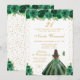This elegant and glamorous birthday party invitation features a beautiful princess with brunette hair and fair skin in a green ball gown. The text combines handwritten script and modern sans serif fonts for a classy and sophisticated look. The floral arrangements, butterflies and gold confetti create the perfect blend of rustic and chic.