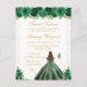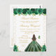 This elegant and glamourous sweet sixteen birthday invitation features a beautiful princess with brunette hair and fair skin in a green ball gown. The text combines handwritten script and modern sans serif fonts for a classy and sophisticated look. The floral arrangements, butterflies and gold confetti create the perfect blend of rustic and chic.