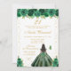 This elegant and glamorous birthday party invitation features a beautiful princess with dark hair and dark skin in a green ball gown. The text combines handwritten script and modern sans serif fonts for a classy and sophisticated look. The floral arrangements, butterflies and gold confetti create the perfect blend of rustic and chic.