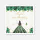 This elegant and glamourous birthday party napkin features a beautiful princess with dark hair and dark skin in a green ball gown. The text combines handwritten script and modern sans serif fonts for a classy and sophisticated look. The floral arrangements, butterflies and gold confetti create the perfect blend of rustic and chic.