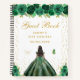 This elegant and glamourous birthday party guest book features a beautiful princess with dark hair and dark skin in a green ball gown. The text combines handwritten script and modern sans serif fonts for a classy and sophisticated look. The floral arrangements, butterflies and gold confetti create the perfect blend of rustic and chic.