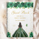 This elegant and glamourous sweet sixteen guest book features a beautiful princess with dark hair and dark skin in a green ball gown. The text combines handwritten script and modern sans serif fonts for a classy and sophisticated look. The floral arrangements, butterflies and gold confetti create the perfect blend of rustic and chic.