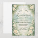 This refined quinceañera design features a soft sage-green watercolor background framed by lush ivory roses, delicate greenery, and elegant gold ornamental accents. The botanical border creates a romantic garden atmosphere while preserving a light, open center for excellent text clarity in print.