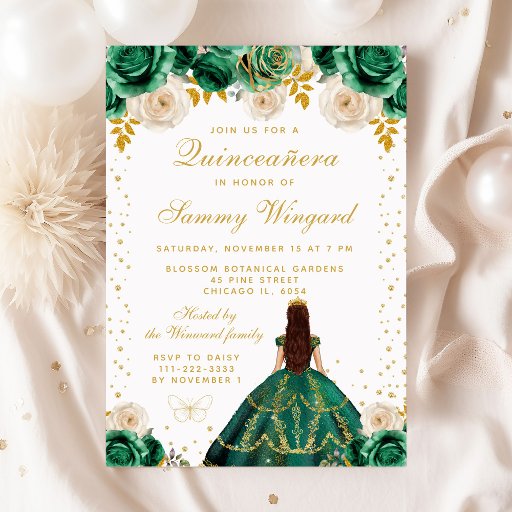 This elegant and glamourous birthday card can be personalised with a name or title such as daughter, granddaughter, niece, friend etc. The design features a beautiful princess with dark hair in a tiara and green ball gown. The text combines handwritten script and modern sans serif fonts for a classy and sophisticated look. The floral arrangements and gold confetti create the perfect blend of rustic and chic.