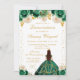 This elegant and glamourous Quinceañera birthday invitation features a beautiful princess with dark hair in a tiara and green ball gown. The text combines handwritten script and modern sans serif fonts for a classy and sophisticated look. The floral arrangements and gold confetti create the perfect blend of rustic and chic.