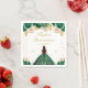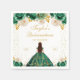 This elegant and glamourous Quinceañera napkin features a beautiful princess with dark hair in a tiara and green ball gown. The text combines handwritten script and modern sans serif fonts for a classy and sophisticated look. The floral arrangements and gold confetti create the perfect blend of rustic and chic.
